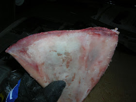 Now, once you've removed enough flesh and soft tissue, look at the flat "blade" of the scapula; you should be able to discern a clear boundary between the soft cartilageneous tissue and the boney tissue - think of the border of a chicken's white cartilage 'breastbone' and the boney breastbone.